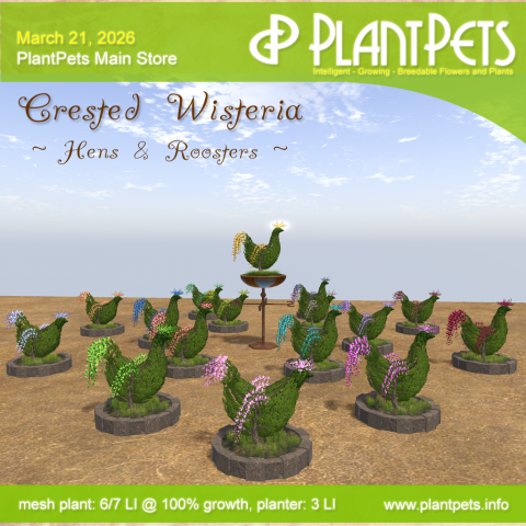 On 21 March 2026, we released the new species, Crested Wisteria. It features 16 variations, each shaped as a bush in the form of either a hen or a rooster. These have been beautifully modelled by our collaborator Kizi Wonder. The set includes 10 common PlantPets, 5 rares, and one limited edition dedicated to Easter 2026.
