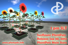 Nine Sunflower plantpets have just been released, 6 common ones and 3 rare ones! All nine are listed in our catalog. Please note that they share the asterales gene with the asters and the daisies! All common sunflowers will be 25% off for members of the group PlantPets Premium until tomorrow, Oct 1st, 3 pm SLT.