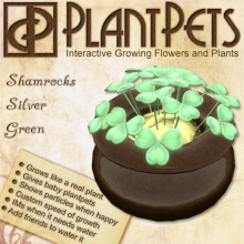 We have released a brand-new limited edition Shamrock *Silver Green*. Only up to 317 copies will be sold, maximum one copy per avatar only. We have also completely brought back all seasonal shamrock plantpets to the PlantPets Main Store. A new Shamrock catalog book is available for free as well. Shamrocks will stay in our store only until the 24th of March!
