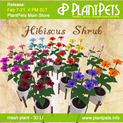 For Valentine's Day we released 11 Hibiscus Shrub plantpets, 7 common and 4 rares (one of them elite) obtainable as rewards by a mission with a deadline the end of February 2021. The plant is mesh 30 LI with very high detail.