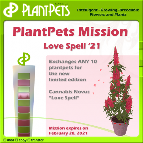 We released a surprise limited edition Cannabis Novus *Love Spell*. It emits hearts particles and has bright red buds. It is available as the reward of a PlantPets mission which costs 500L and which exchanges any 10 growing plantpets for one seed of this new limited edition! The mission will be available for purchase until the 27th of February and must be completed by the end of February.