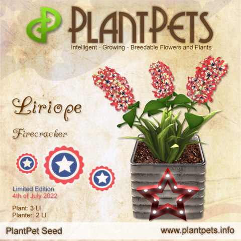 The PlantPets July mission rewards either the newly released LE Liriope *Firecracker* dedicated to the 4th of July 2022 or the older Lilac Bush *Old Glory*. The deadline for completing the mission is the end of July.