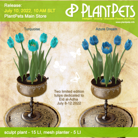 On the 10th of July, we released two limited edition tulips, Tulip *Turquoise* and Tulip *Azure Dream* dedicated to the biggest festival in Islam Eid al-Adha, which lasts 5 days from the 8th to the 12th of July this year. Both limited editions are available as rewards of a mission with a deadline of the 31st of July. The mission is priced at L$500 as the tulip plant parts are an older build. For the limited editions, we arranged them in a beautiful antique incense burner around a golden plated turquoise stone that matches the color of the tulip.