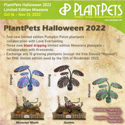 We released five new Halloween-themed plantpets. These are 2 limited-edition pumpkin patch plantpets and three blood dripping monstera plantpets. All are available by completing a mission by the 13th of November. Enjoy your Halloween season!