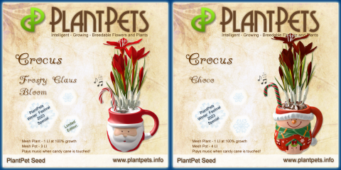 Today at the PlantPets Winter Holiday Gala, we are releasing two new Crocus plantpets: the limited edition Crocus *Frosty Claus Bloom* and the seasonal elite Crocus *Choco*. They are specially crafted to be given as awards to the participants in the PlantPets Winter Holiday Contest for designing 4x4 meter dioramas. Of course, once they come as baby seeds to breeders they will become available in the shops of breeders.
