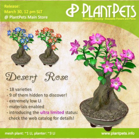Four common and five rare varieties, including one rare elite, will be hidden, i.e. will not appear in the PlantPets Web Catalog initially. These varieties will only be revealed when an avatar acquires one as a baby seed through breeding. The first individual to uncover a hidden Desert Rose, by obtaining its seed, will be rewarded with an additional seed of the same variety. Information regarding these hidden Desert Roses and the discoverers will be accessible at https://plantpets.dejapi.com/?q=discoverers.