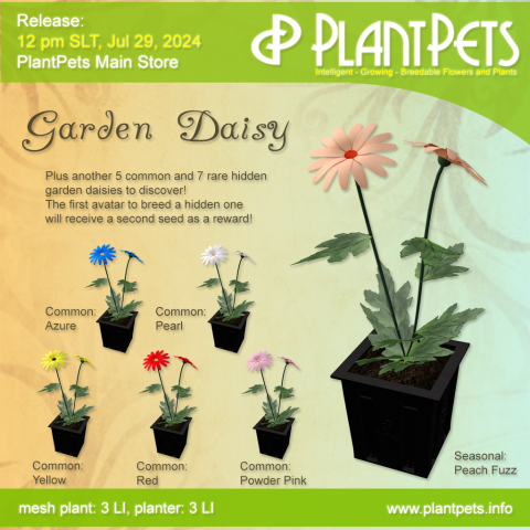 5 common and 1 seasonal will be available for purchase in the PlantPets Main Store. Another 5 common and 7 rare were hidden and obtainable only by breeding. One hidden daisy has left since. The first av to discover them by breeding will get a second seed.