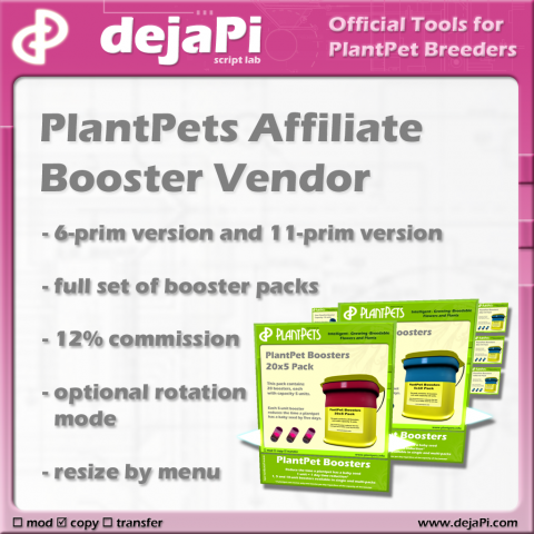 The booster vendor comes in two versions: 6-prim vendor and an 11-prim vendor. The booster vendor only is free for the group PlantPets Premium for the next 2 weeks. If you would like to get it please join the group PlantPets Premium and download it from the group messages until the 19th of December.