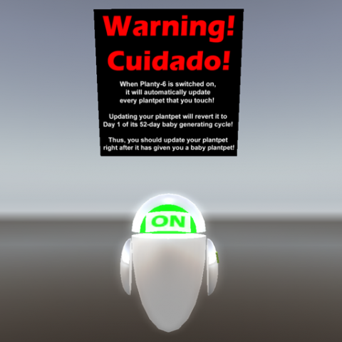 You can get the update robot Planty-6 by pressing the “Get Update” button in the menu of any of your plantpets. The robot will be also delivered with all babies of plantpets which haven’t been updated yet. Only Build 5 plantpets will be able to apply this update. If you have an older version plantpet you will need to update it to Version 2.0s Build 5 first. You need ONLY 1 copy of Planty-6 to update all of your plantpets. This update is even easier than the previous ones. You need to turn ON the robot once and then the robot will update every plantpet within chat distance that you touch.